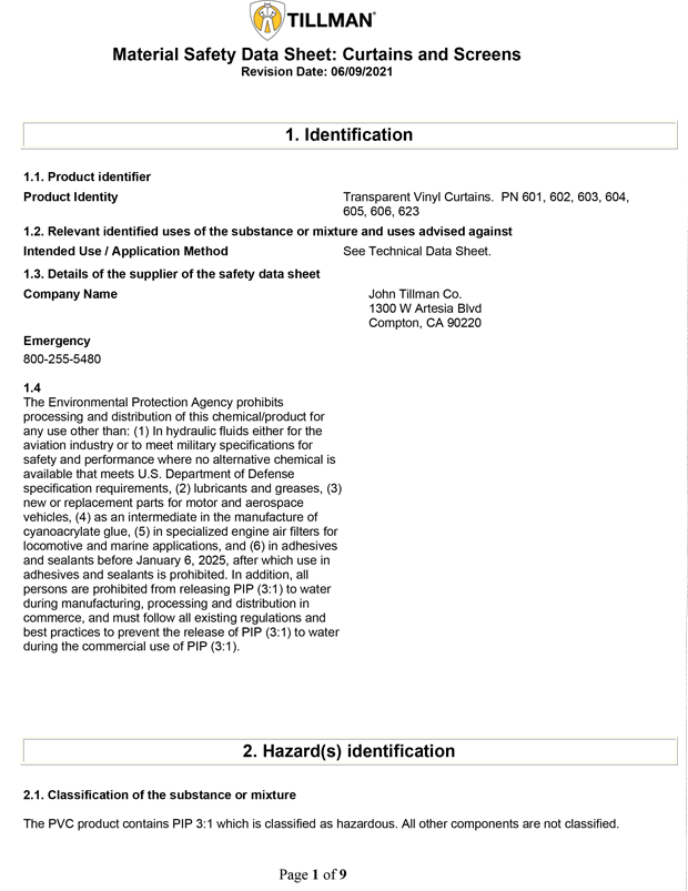 • Tillman® transparent vinyl curtains have FM 4950 Approval, NFPA 701 Approval, CPA 1-8 and California Fire Marshall’s requirements for flame resistance